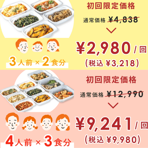 | 料金 | 4,838円 (2食3人分) 12,990円 (3食4人分) | 4,640〜 11,280円 (8〜24食) | 単品購入 399円〜/品 |