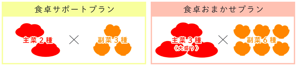 | 料金 (税込) | ◎食卓サポートプラン:4,838円 (主菜2種、副菜3種の5個セット) (3人家族の夕食2回分を想定) ◎食卓おまかせプラン:12,990円 (主菜3種(大盛り)、副菜6種セット) (4人家族の夕食3食分を想定) |
